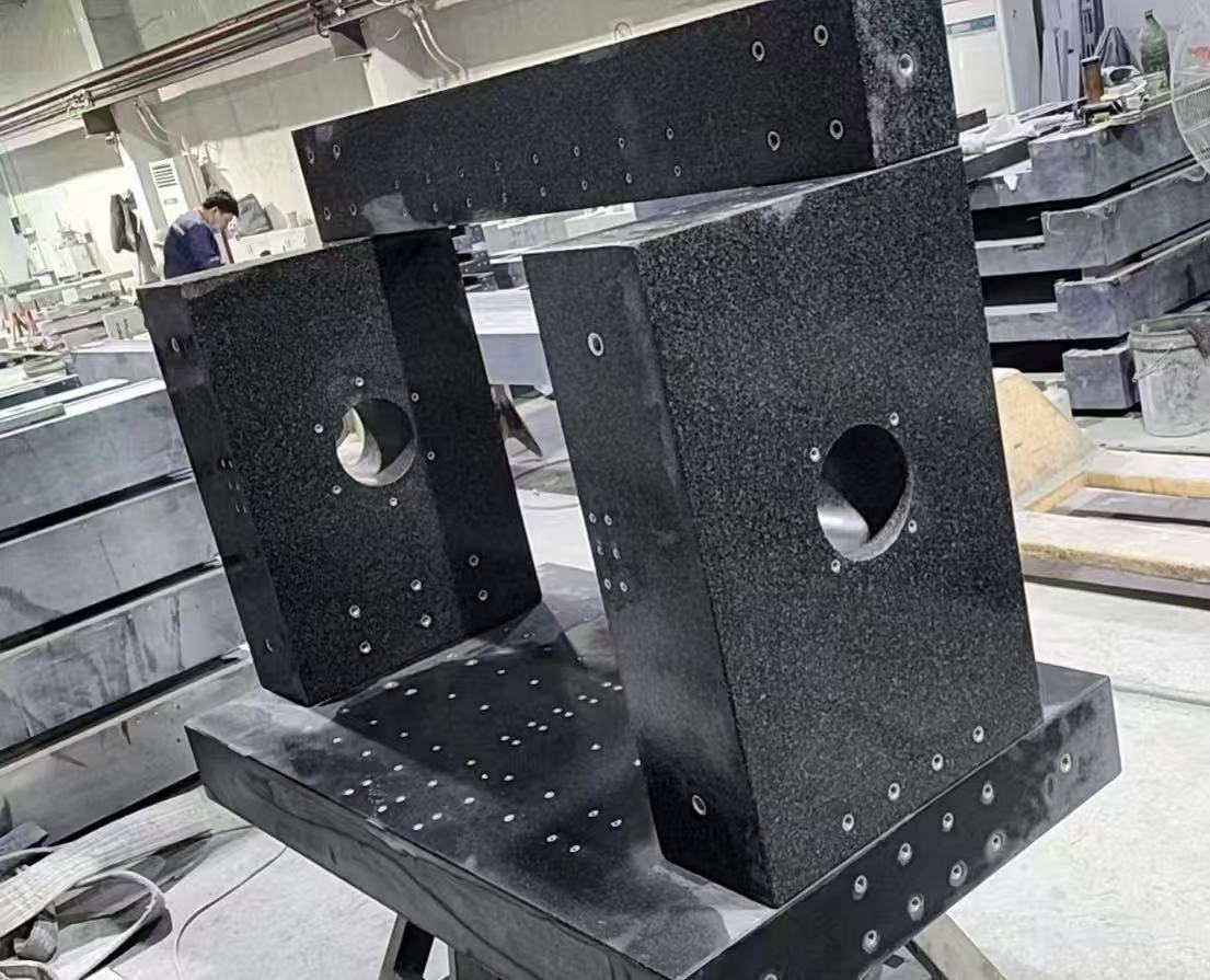 Marble gantry components (such as gantry bed, columns, and beams) are made of natural granite or artificially synthesized stone. With their high rigidity, low coefficient of expansion, and corrosion resistance, they have become an ideal choice for precision machine tools (such as gantry grinders and coordinate measuring machines). This plan focuses on material selection, manufacturing processes, and full lifecycle management to ensure that the gantry structure maintains a long-term precision of ± 0.005mm/m level.